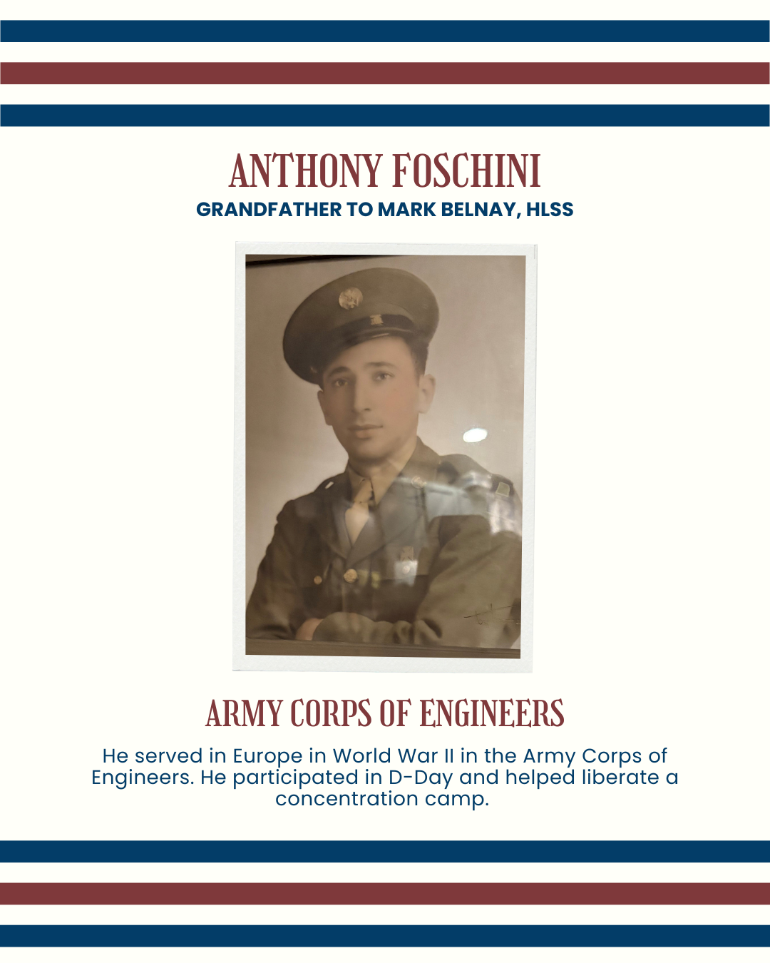 Mark Belnay, History Teacher at Hidden Lake Secondary School believes it is very important for his students to not only honor U.S. Veterans, but to understand how their sacrifices have shaped our lives. For him, the lesson is very personal. His grandfather, Anthony Foschini served in Europe in World War II in the Army Corps of Engineers. He participated in D-Day and helped liberate a concentration camp.